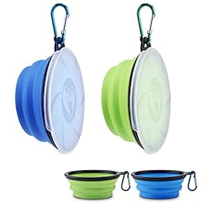 Aoliandatong 2PCS Folding Bowls for Dogs and Cats, Pet Bowl, Silicone Bowl, Portable Dog Bowl with Lids and Carabiner for Travel and Mountaineering (1000ML Blue and Green) Buy Now