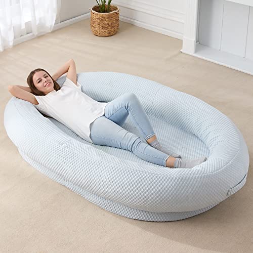 【Ergonomic Support】:The whole design of human bean bag bed meets the ergonomics concept. The raised rim around provides a sense of security and also excellent support for neck and head. The thicken waved bottom foam prevents people from lying close to the ground and has a strong support for the spine.You can also get stress and anxiety reduced by tucking your hands and feet under the pillow border.