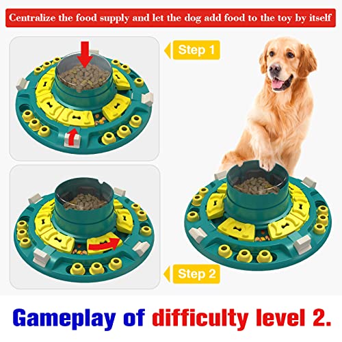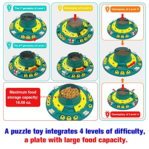[Integrated 4 difficulty levels into one toy] By adjusting the limiter of the toy to increase or reduce the number of sliding-lid treat boxes that can be moved. and by adjusting the food dispensing channel to control the food dispensing speed and difficulty. With 4 difficulty levels integrated into one toy, the detailed usage is displayed in our product video.